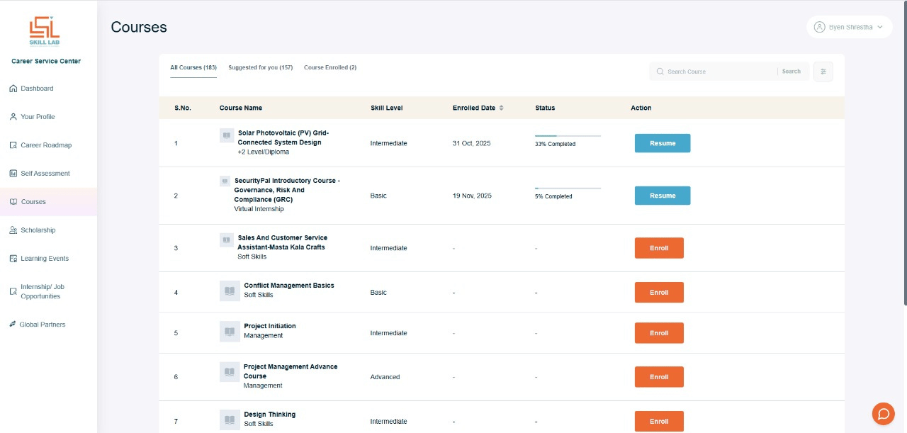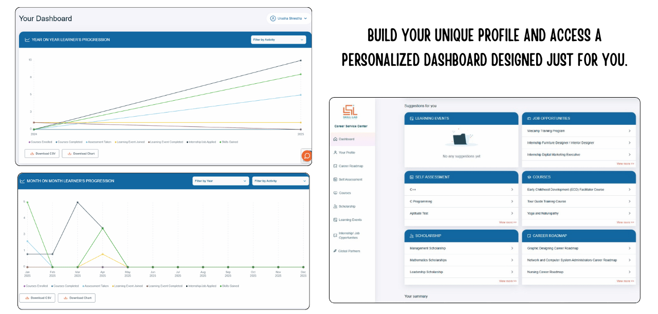 Access a customized dashboard that tracks your learning journey, skill progress, and key goals all in one place.