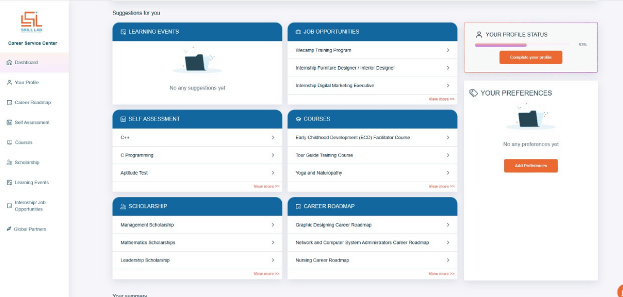 Fostering a future-ready workforce, Skill Lab brings a one-stop AI-powered digital career service software platform. Our advanced AI-powered career guidance including employment matchmaking and market-informed training, bridges education with employment opportunities – accelerating the Education-to-Employment Transformation.